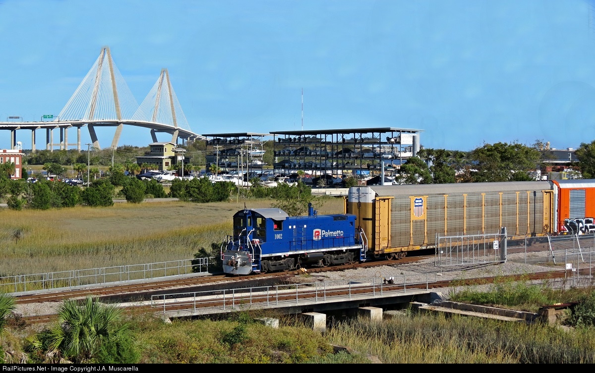 | On a beautiful October day, one of the Palmetto Railways switchers works the East Bay Street Terminal in downtown Charleston, SC. They are working on building the empty autorack train which would run up to Greer later that night. |