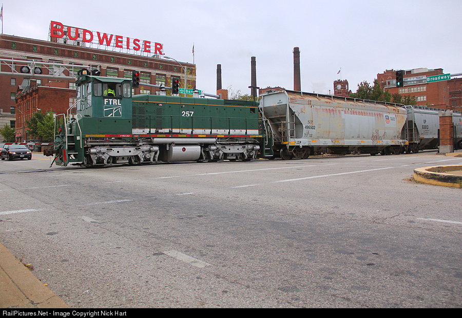 | Fresh out of the processing plant, FTRL 257 leads barley loads into the yard, crossing Broadway Street. |