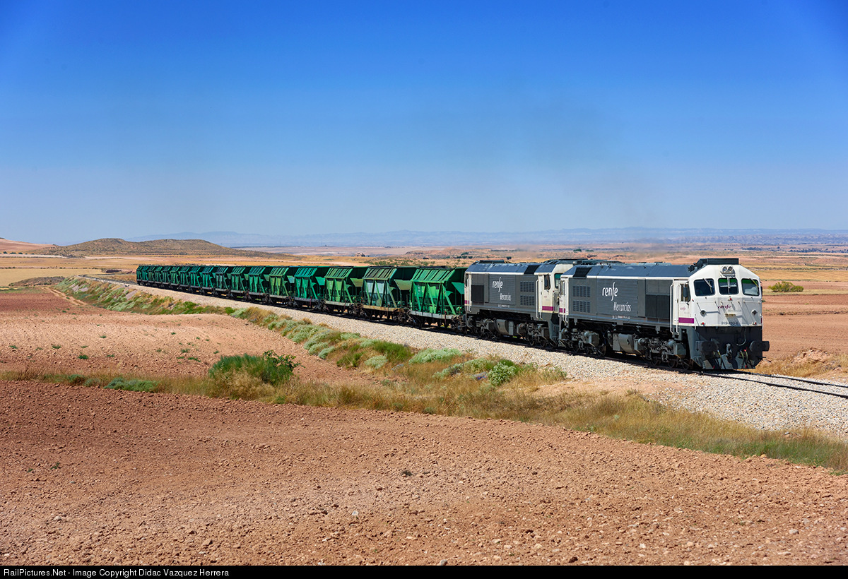 After leaving the station of Samper de Calanda, the coal train loaded, goes to the thermal power plant of Andorra de Teruel. In charge of him, the "Retales" 319.203 and 319.240. This train is starting at port of Tarragona with electric traction, and in station of Samper, two diesel locomotives take the train along of this desert of Teruel to the power plant in Andorra de Teruel.