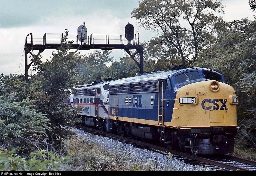 Elephant-style F-units pass under the classic old Western Maryland Railway signal bridge in Chambersburg. Trains traversed this route from 1881 to November 2, 2000. The tracks are gone today, but the right-of-way has been turned into a 1-1/2 mile rail-trail. The 116 is an ex-Clinchfield unit, built as an F3A in 1948. The occasion was MARC's "Patriot Special," offering several shuttles that day between Chambersburg and Lurgan.