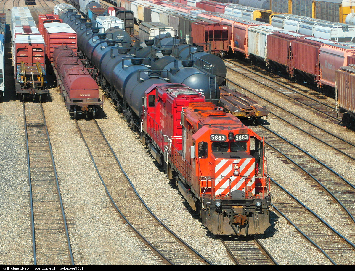 CP 5863 and CP 6000 are seen working hard as they shunt the big CP Winnipeg Yard. CP 5863 wears the full-sized multimark, which was one of just two remaining on the active CP roster (CP 5911 was the other).