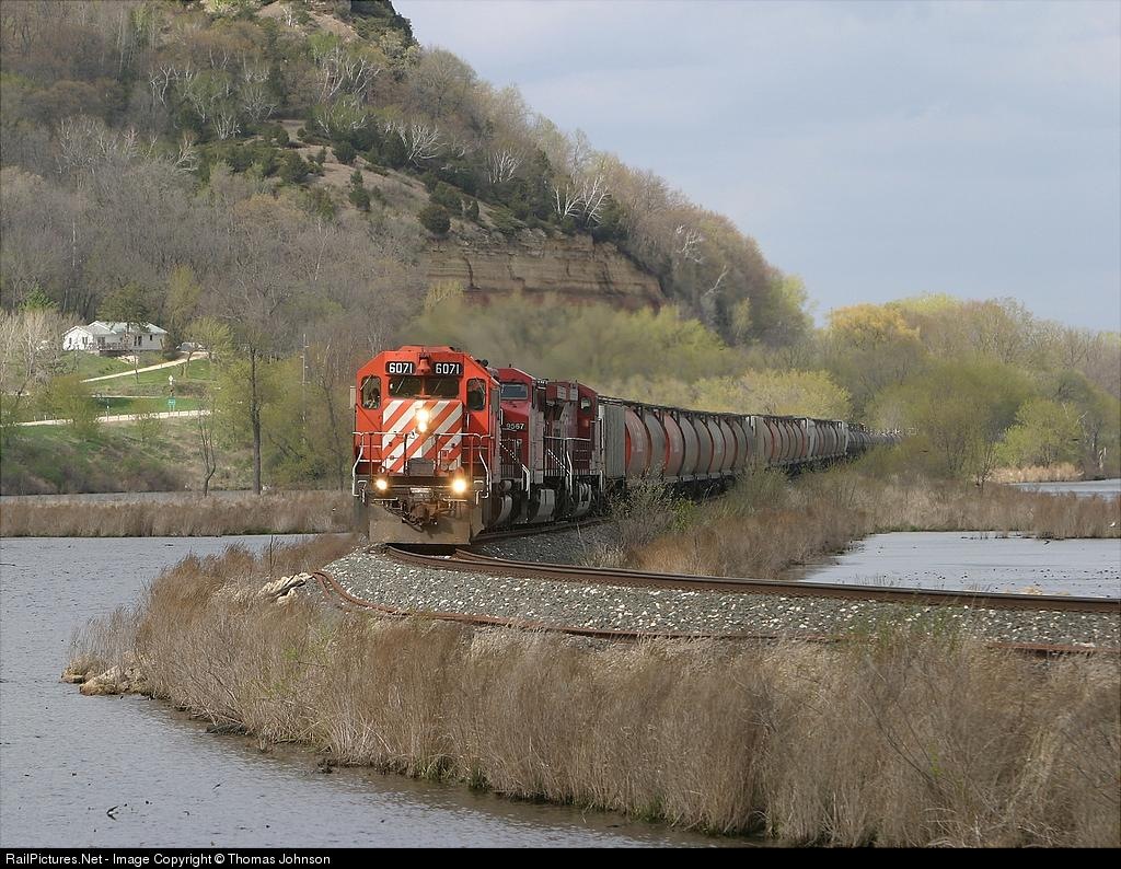 | Canadian Pacific Train 69-005ours over the IC&E from LaCrescent, MN - Chicago, IL while the bridge over the Black River in La Crosse is being replaced. |