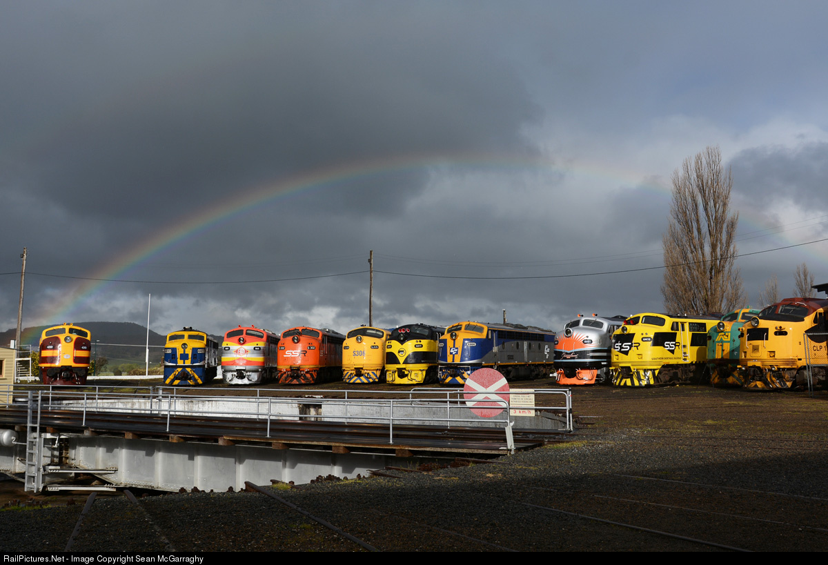 During the preparation and positioning of locomotives for "Streamliners 2016", bulldog nosed 42101, 4477, B65, S302, S306, S317, S300, B61, GM10, GM19 & CLP11 sit around the turntable at the Goulburn Roundhouse as a rainbow is cast over the gloomy skies.