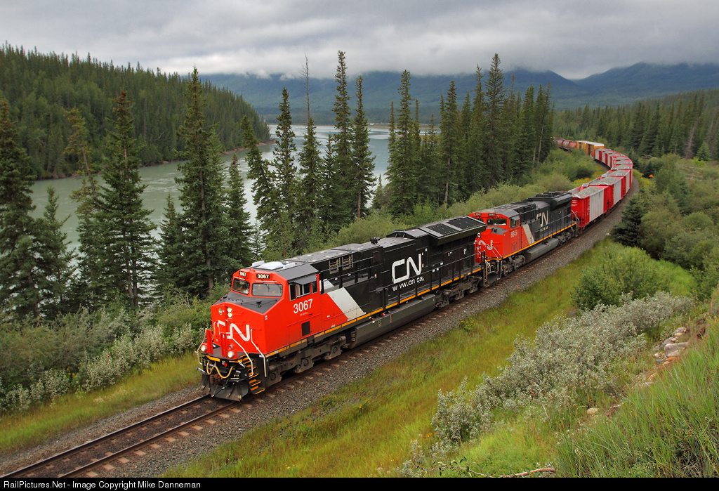 New Canadian National GE ET44AC No. 3067 leads an eastbound manifest freight through Solomon, Alberta, on the morning of August 7, 2016. The Brule Range is cloaked in low clouds, which will burn off in a couple of hours revealing another sunny, blue sky day in Jasper National Park.