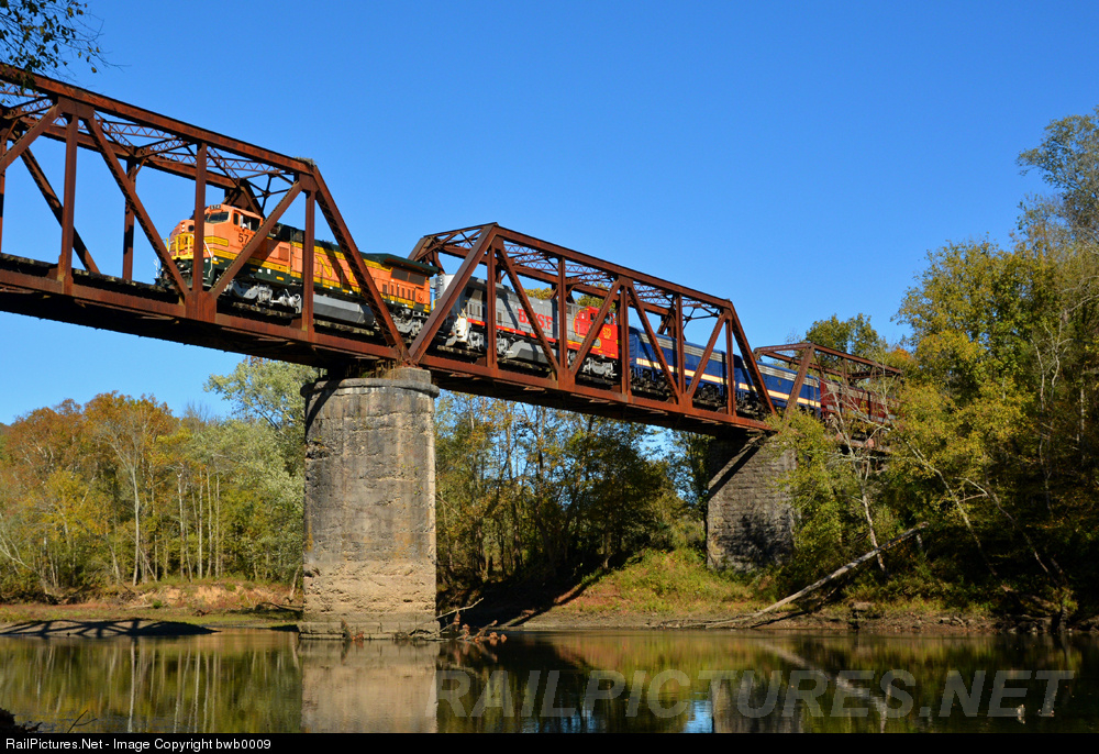 | NERR 573 leads the Tennessee Central Railroad Museum's Fall Foliage excursion back westbound over the rarely photographed (for a good reason! The hike back from the I40 rest area is awful) Caney Fork River bridge near Buffalo Valley, TN. |