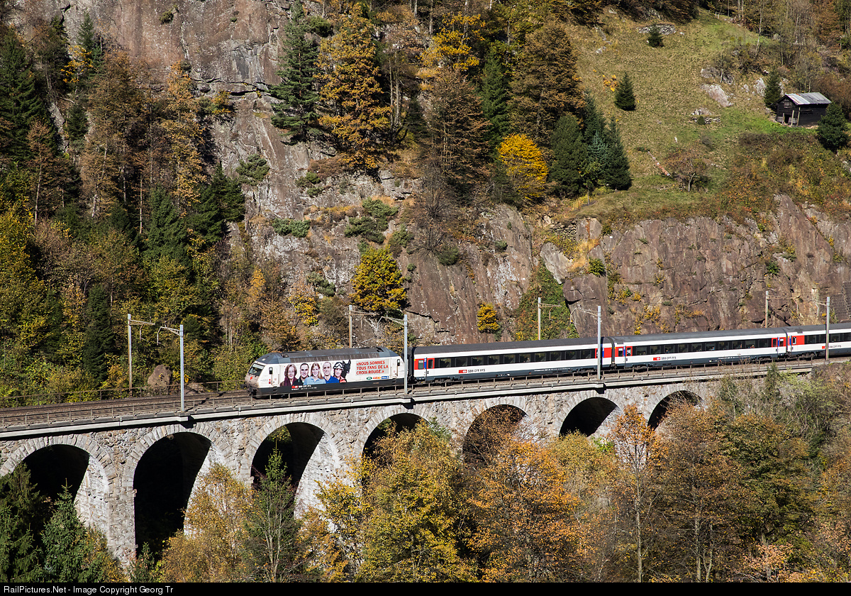 | Re 460 # 041 with publicity paint scheme for the red cross is pulling Interregio 2421 Zürich-Locarno over the Secken viaduct on the Gotthard north ramp. This stone viaduct with 10 bows has the same appearance as when it was built around 1880, it only was widened for the second track about 1890. |
