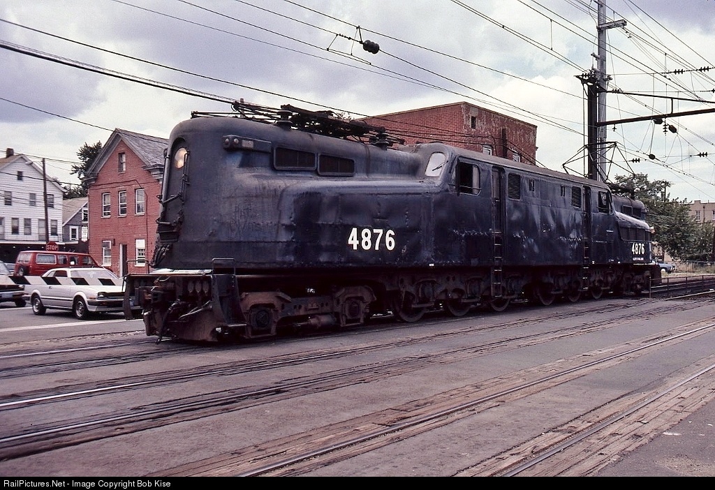 Exhibiting severe corrosion issues in its skin, the 4876 is crossing John Street, heading back to the yard to await its next trip to Penn Station, New York. Note the graffiti scrawled in the dust on the nose. No. 4876 was built by Altoona/Westinghouse in January, 1939. One of 16 surviving Gs, the 4876 was most famous for crashing through the Washington DC Union Station bumper post on January 15, 1953 at the point of The Federal Express. It also tripleheaded with sister 4877 and F40PHR 363 on June 6, 1981, pulling the Amtrak-Conrail-Lancaster Chapter NRHS "Farewell to the GG-1" Amfleet excursion train.