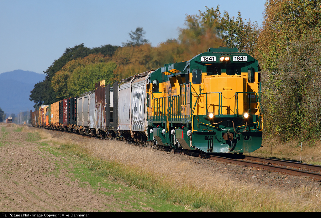 Albany & Eastern’s turn to Albany approaches Red Bridge Road between Albany and Lebanon, Oregon, on September 26, 2016. Leading the train is AERC No. 1841, a former Cotton Belt (SSW) GE B40-8.