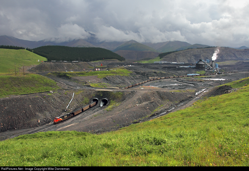 Under an ominous sky that foretells rain, the third section of a Canadian National coal train departs the loader at Teck’s Cardinal River Operation near Cadomin, Alberta, on August 8, 2016. The 50-car train is set up 1+1, with GE ES44AC No. 2900 on the lead, with sister ES44AC No. 2958 set up as a rear DPU. Both locomotives will ease the the loads down a steep 3% grade of the 5.5-mile Luscar Industrial Spur, continue east (north) on the Mountain Park and Foothills Subdivisions and combining with the other two sections at Bickerdike (near Edson).