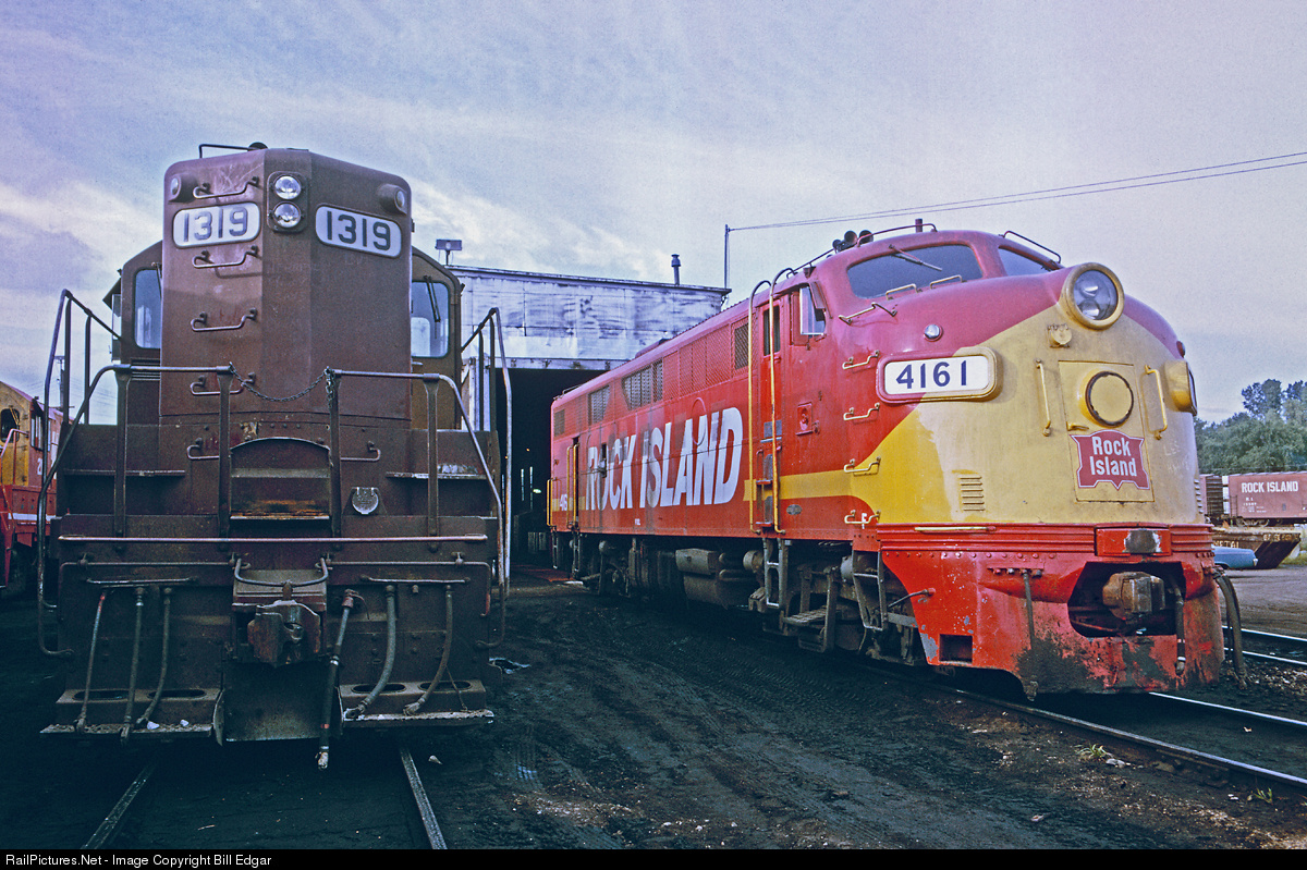 Rock Island F9M 4161 and GP9 1319 idle at Rock Island's Inver Grove Yard engine facility in South St. Paul. The F unit was originally built as an F3 for Union Pacific, and later upgraded to an F9 before being sold to Rock Island. Rock Island ran south from the Twin Cities all the way to Galveston, TX before its break up in 1980.