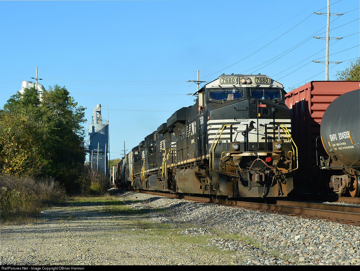 | 2 of 2: Following closely beside CSX Q365, NS 7680 leads a trio of GE's with a rather unusually symboled grain train, as the two head south along the CSX Toledo Subdivision in a race. |