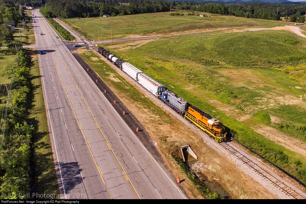 On a hot early May morning, G&W-Chattooga & Chickamauga Railway (CCKY) Train 702 with a pair of first gen geeps passes the sight of the future Rock Springs Industrial park, as the six car train work its way north on the former Central Of Georgia CR&S right of way for Chickamauga, GA to pick up some cars. Eventually arriving to Chattanooga, TN where the train will interchange with Norfolk Southern Rwy. Photo from the John Kirk Collection.