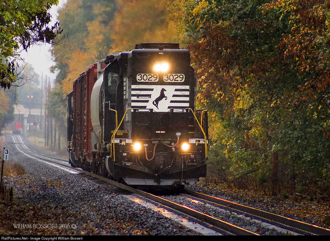 Engine 3029 long hood forward at the point of a westbound NS-H02 having just completed there work near Totowa spur just 12 miles east of Mountain Lakes station stop is returning west with few cars and engine 3010 at far the end of the consist on very rainy gloomy day, but offset with colorful Autumn leaves still holding on there branches. |
