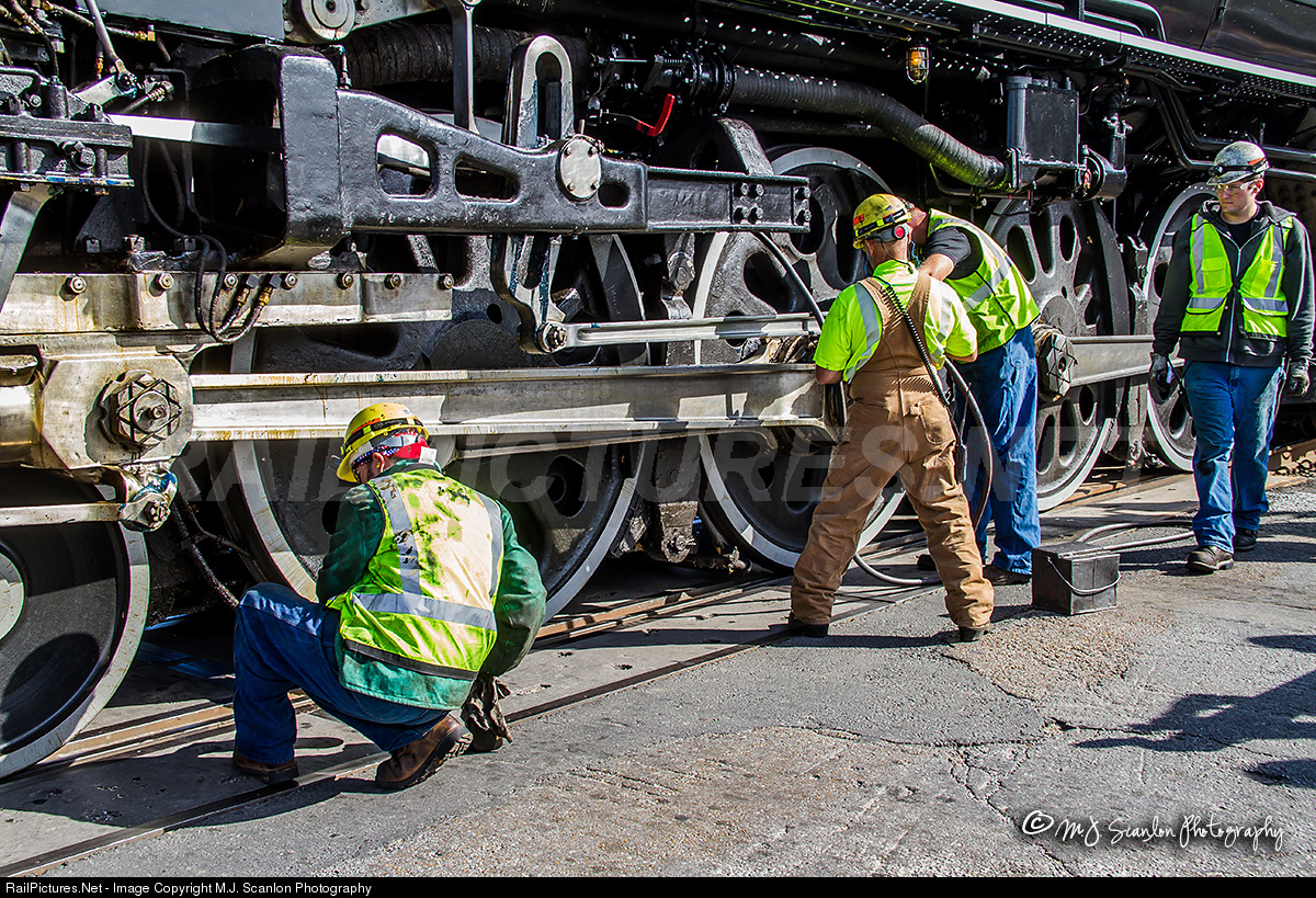During the stop in Wynne, Arkansas, the maintenance crew performs lube service on UP 844.