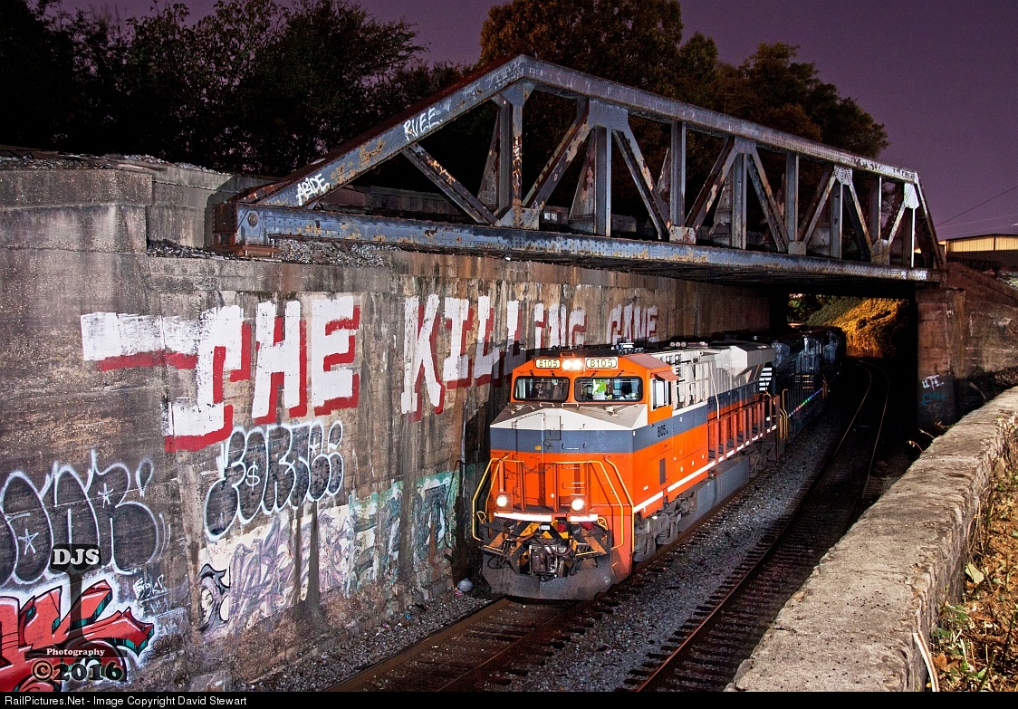 | Empty grain train, 51N lead by the Interstate heritage ES44AC 8105 charges through the gulch and beneath the Griffin District as it nears a crew change in Atlanta, Georgia. |