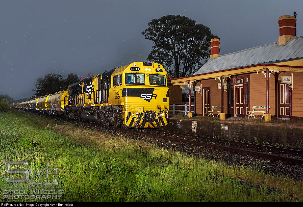 | With a friendly wave from Southern Shorthaul Railroad driver Bernie Baker, SSR 101 - a Downer/EDI Rail (EMD) GT46C ACe - takes 17 grain wagons eastbound past the historic and restored Borenore, New South Wales depot, near Orange, NSW. The train is seen at 0730 hrs (local NSW time) rolling under unprecedented torrential rainfall that the NSW region saw during September/October. |