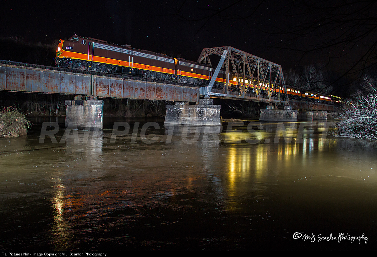 On the Little Tallahatchie River Bridge, an engine posing as Illinois Central 4035 has stopped for a night photo shoot. This is actually Iowa Pacific engine 515 which was built in 1953 for the Chicago and Northwestern as number 5029B.