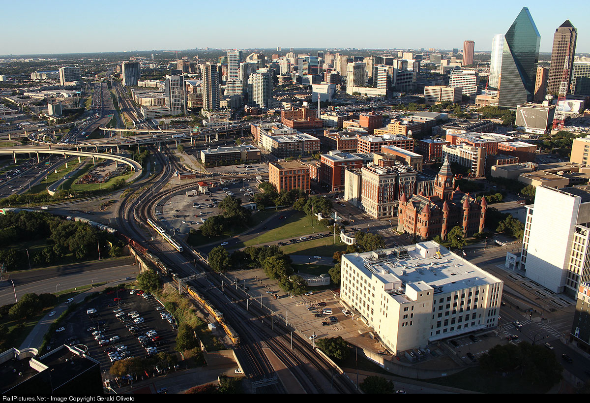 The roadway in the shadows to the right of the light rail train is Elm Street and the location of the John F. Kennedy assassination. The building atop the hill (with the parking lot to the left) is the Texas School Book Depository, where Lee Harvey Oswald fired the fatal shots from a sixth floor window.