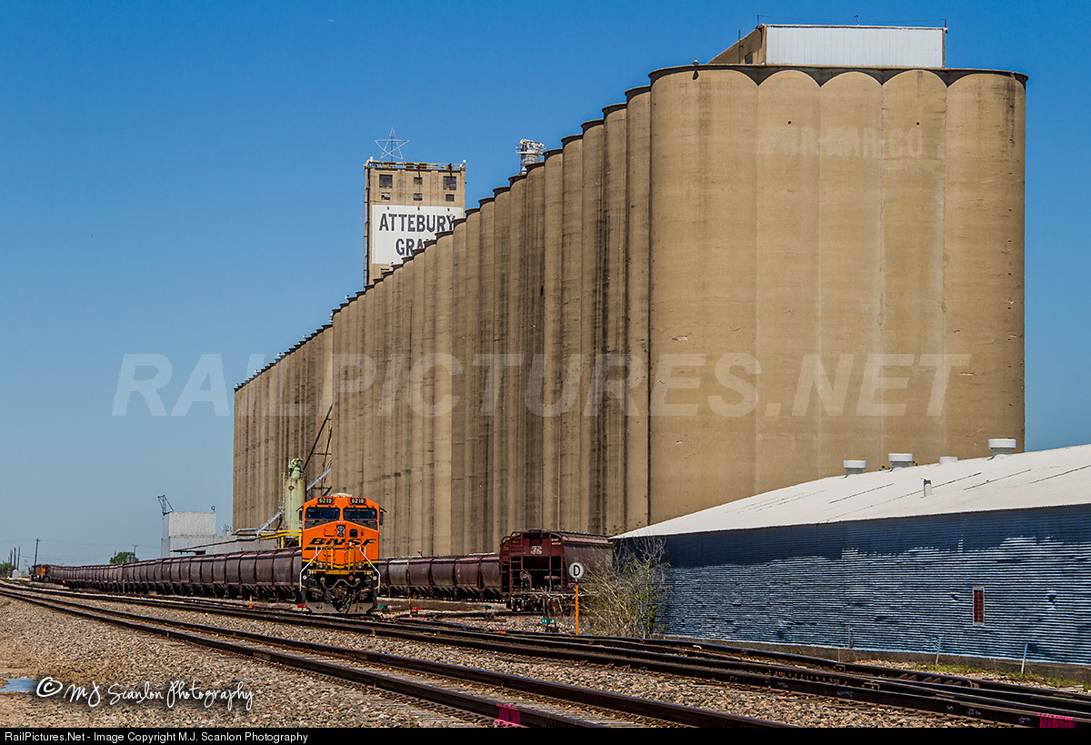 BNSF 6219 works a unit grain train along the Wichita Falls Sub at Attebury Grain in Saginaw, Texas..