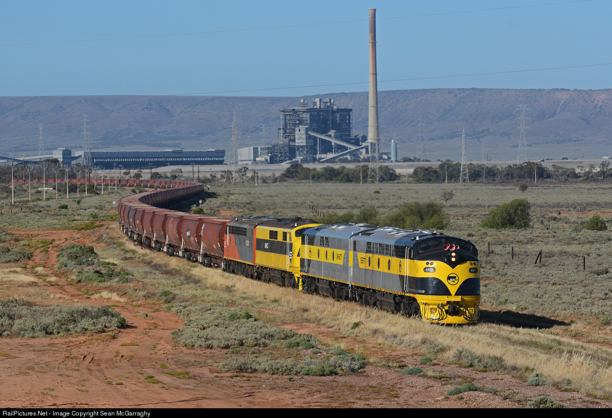 With the purchase by Southern Shorthaul Railroad of 180 ex Pacific National coal hoppers that were previously used to load coal out of Leigh Creek, a transfer was organised to have these hoppers moved from the Port Augusta power station were they have been stored since late April 2016 to Lithgow in NSW. The only spare locos SSR had to operate this movement were S317, GM27, GM10 & S302 making for a quad bulldog lashup as they depart Port Augusta.