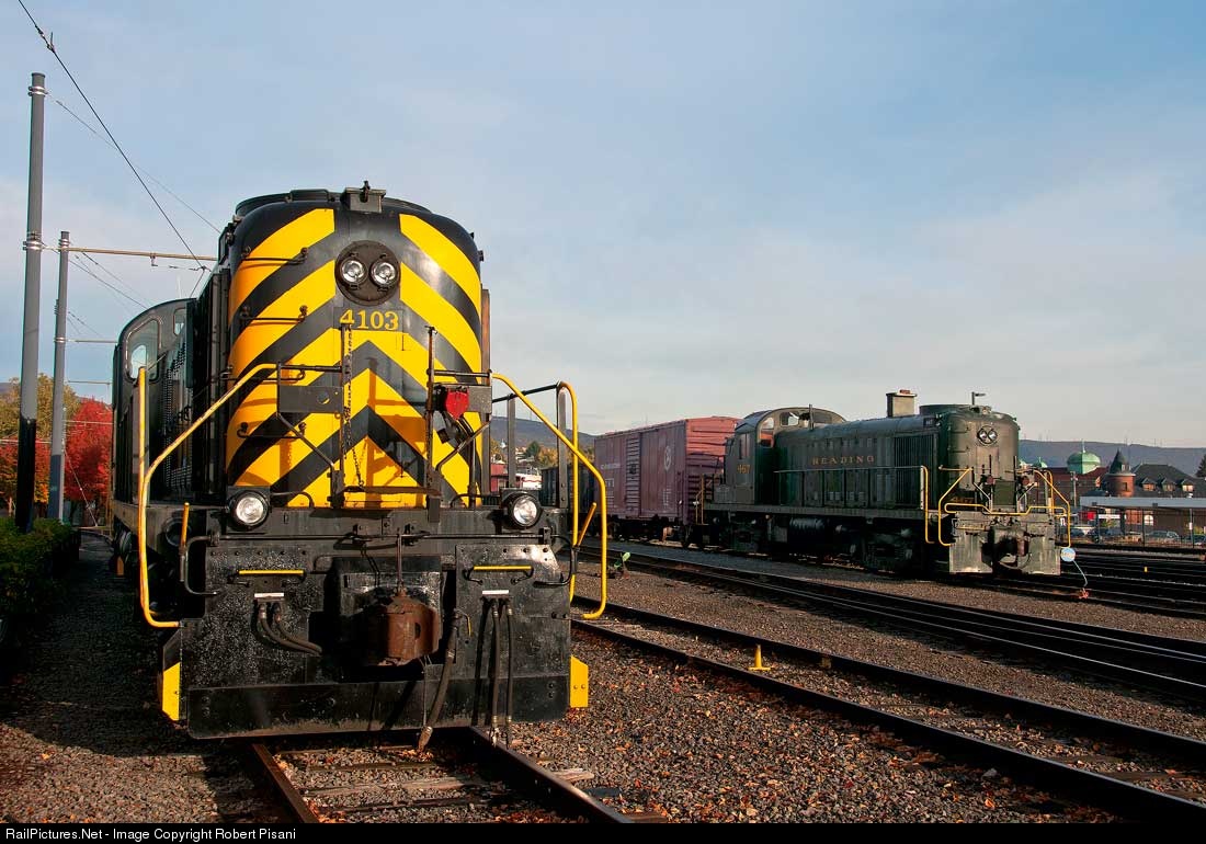 Delaware-Lackawanna 4103 (wearing original D&H colors) idles at the Steamtown Yard next to Reading 467 which is tied onto a small display train. In the background at right is the former Jersey Central Lines Scranton station. There were five RS-3s present here on this morning, four of which are in-service on the DL.