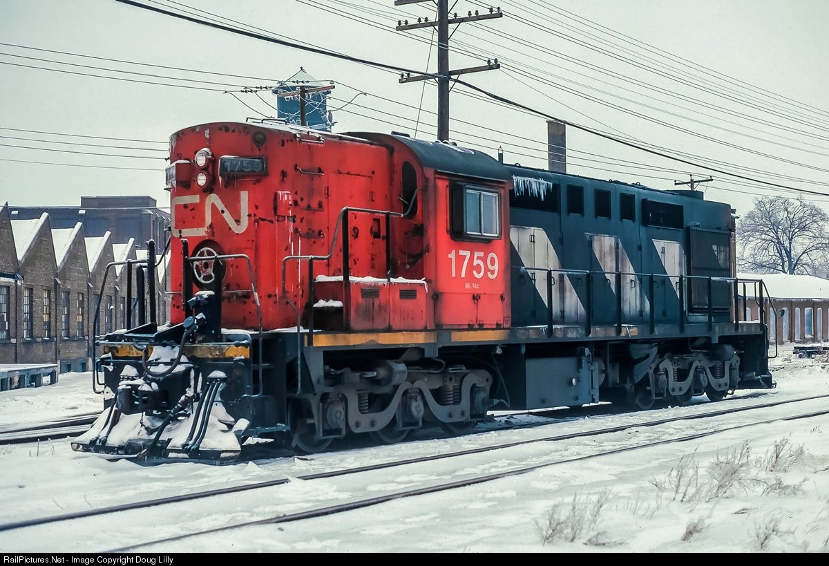 The Canadian National created a new locomotive model in the mid 1970’s when it had a need for additional locomotives to be assigned to the light trackage branches in the Maritime Provinces. Thirty eight MLW RS18’s were rebuilt, derated to 1400 horsepower, and fitted with A1A trucks from retired RSC-13’s and RSC-24’s. The new configuration was designated RSC-14. Here one of the rebuilds is at the western end of its assigned territory as it goes to work in Saint-Hyacinthe, Quebec as a nasty ice storm rolls into the area. .