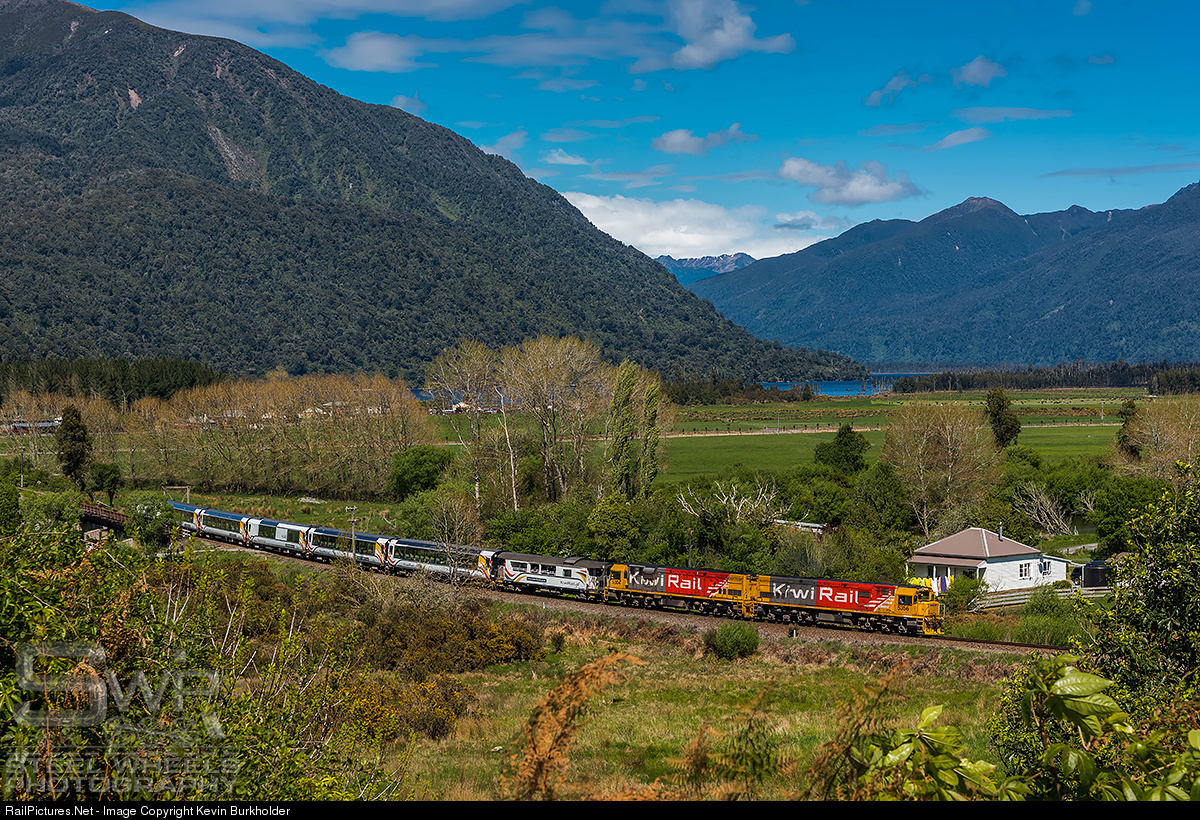 Trains on 3' 6" (1.067m) track from Whangarei to Bluff with virtually heritage rebuilt EMD and GE locomotives still the mainstay power. The network was privatized in 1990's and operated by Toll until 2008 when state owned KiwiRail was established.