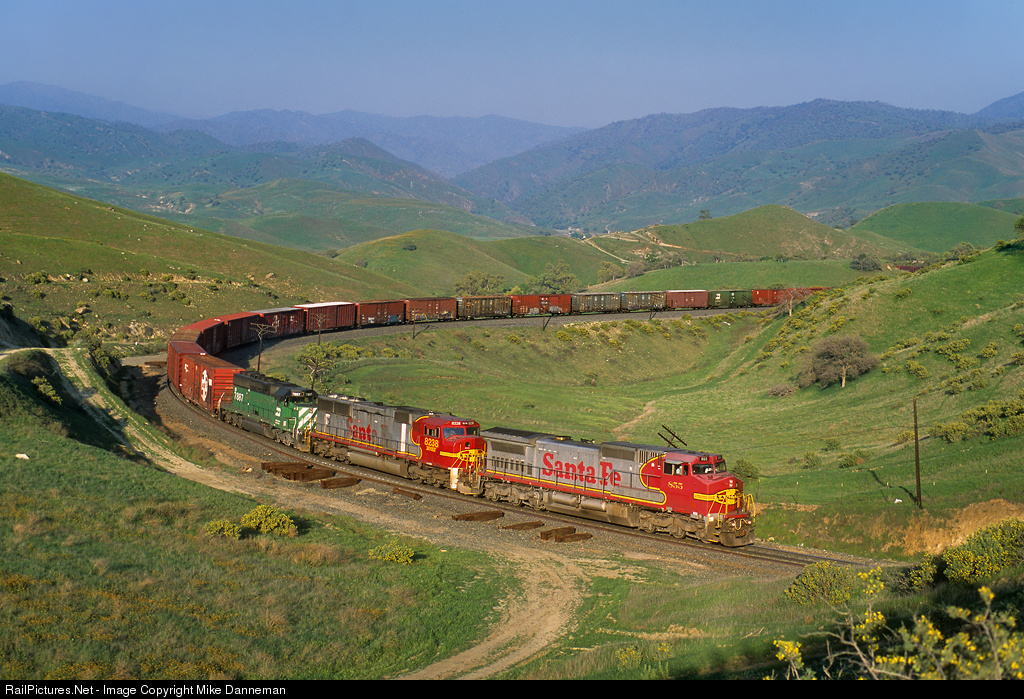 Wine train on Tehachapi Approaching Tunnel 2 at Bealville, California, on March 27, 2001, is the so-called “wine train” led by Santa Fe C40-8W No. 855. This train is an eastbound unit boxcar train, mostly insulated and a good percentage loaded with Gallo wine, originating at Modesto heading for eastern markets out of Selkirk, New York.