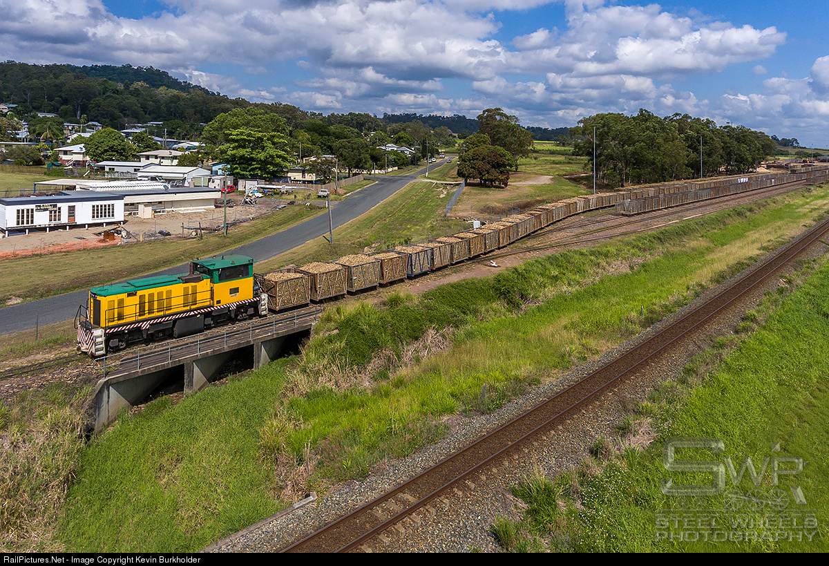 A loaded cane train is departing the Wilmar Plane Creek Mill marshalling yard in Sarina, Queensland, with a cut of rakes carrying sugar cane for processing at the mill. The Walkers GH500 locomotive, #1 and named the Allan Page, along with the 4-ton rakes (cars) are 610 mm, while the tracks in the foreground belonging to Aurizon are 1067 mm.
