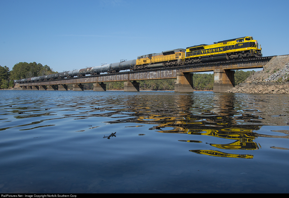 | A Virginian Ace in Central of Georgia's court: SD70ACe number 1069 and a former UP SD90MAC (soon to become an NS SD70ACU) glides across Lake Martin near Alexander City, Alabama with train 198. This daily mixed freight operates from New Orleans to Birmingham, then across the former Central of Georgia mainline to Columbus (Ga.) and Macon. Photo by Casey Thomason. For more information about Norfolk Southern, visit www.nscorp.com |