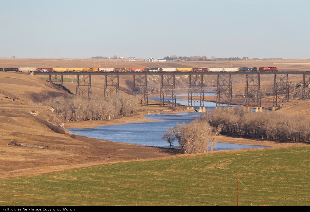 Train 464 makes its way east across the bridge near Monarch. This bridge was built by the same company that built its more famous bridge in Lethbridge.
