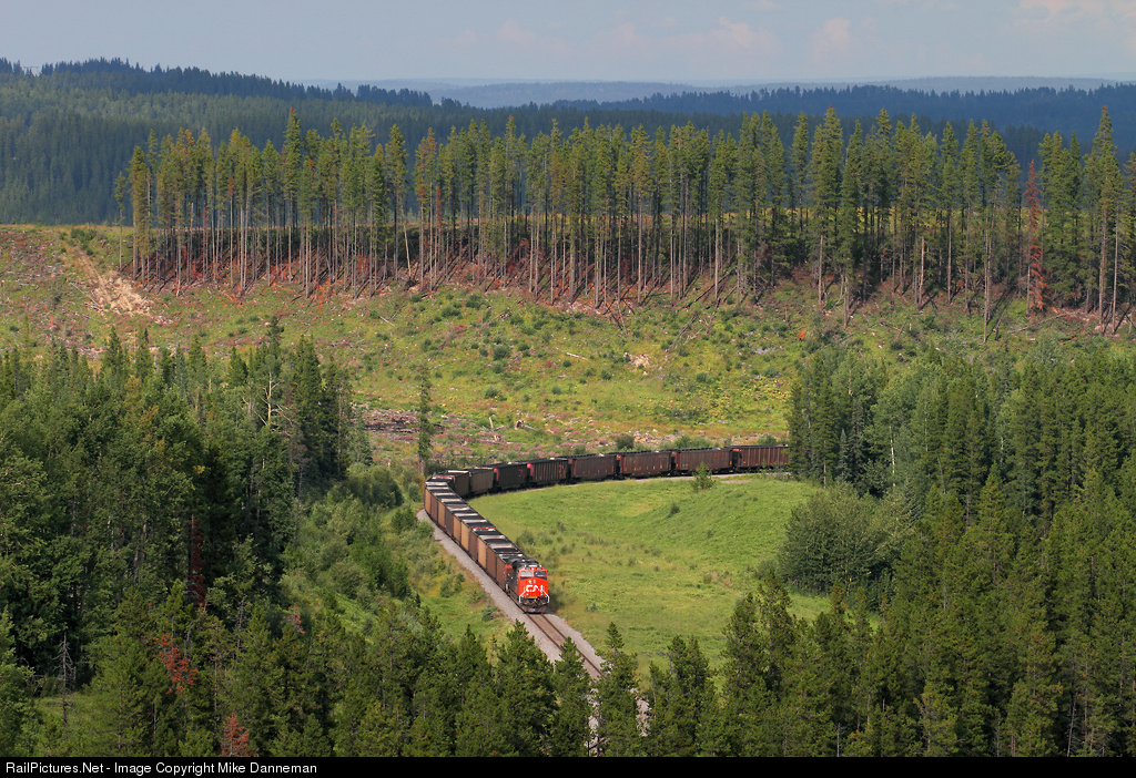 An eastbound Canadian National coal train is between Mercoal and Coalspur, Alberta, heading toward the junction of the Foothills Subdivision at Parkhill Junction on August 8, 2016. This train is the third and final section of a coal train loaded at Teck’s Cardinal River Operation near Cadomin. The 50-car train is set up 1+1, with GE ES44AC No. 2900 on the lead, with sister ES44AC No. 2958 set up as a rear DPU, and will combine with the other two sections at Bickerdike (near Edson). In this view, rear DPU No. 2958 trails the train into several more horseshoe curves before reaching Coalspur.