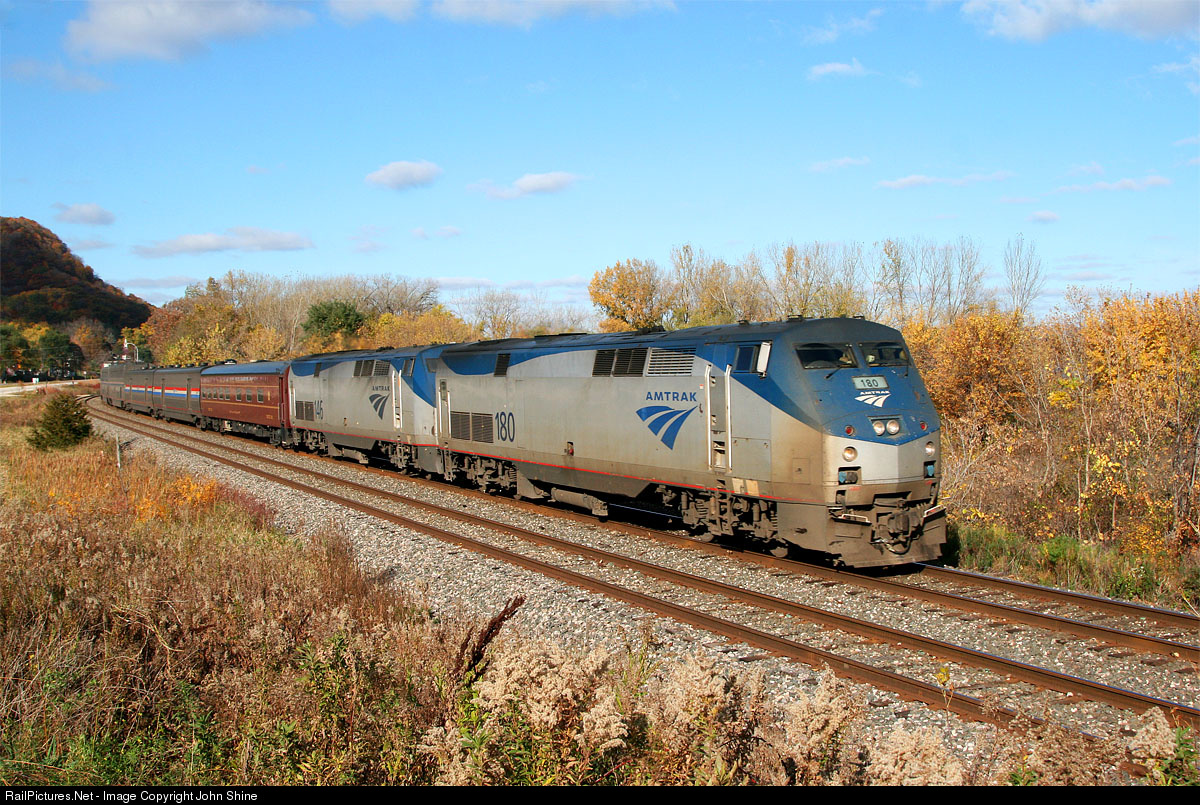 RailPictures.Net Photo: AMTK 180 Amtrak GE P42DC at Homer, Minnesota by John Shine