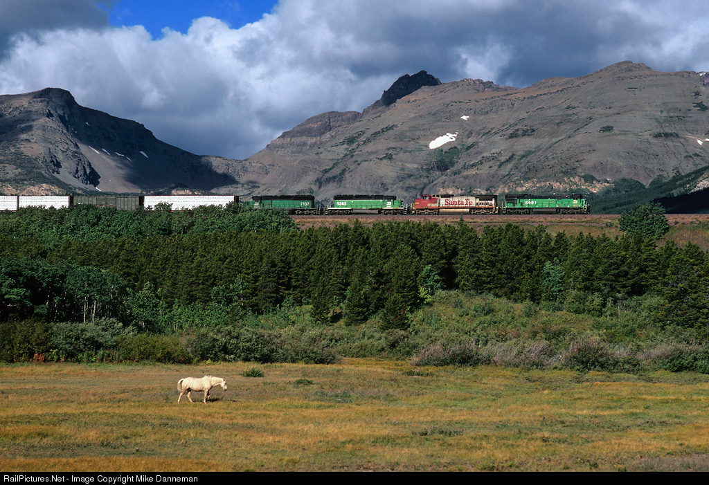 A disinterested horse plods along as an eastbound Burlington Northern Santa Fe freight rumbles through Bison, Montana, while crossing Marias Pass on the southern border of scenic Glacier National Park. Burlington Northern GE C30-7 No. 5581 leads a Santa Fe C40-8W and two BN EMD SD40-2s.