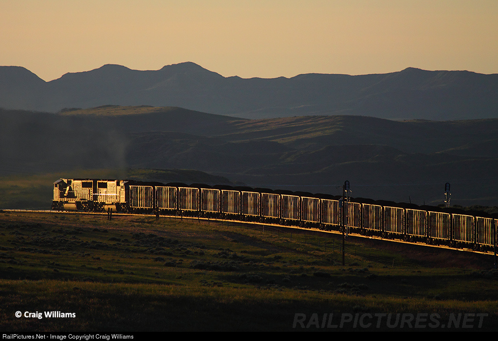 | With 105 loads of coal in tow and a DP unit on the back, this coal train is about to top the 1% grade that they have been fighting for the last 6 miles between Arvada and Kendrick. This train was loaded at Dry Fork Mine, WY on the Campbell Sub and is heading to Stanton, ND on the Zap Line branch. |