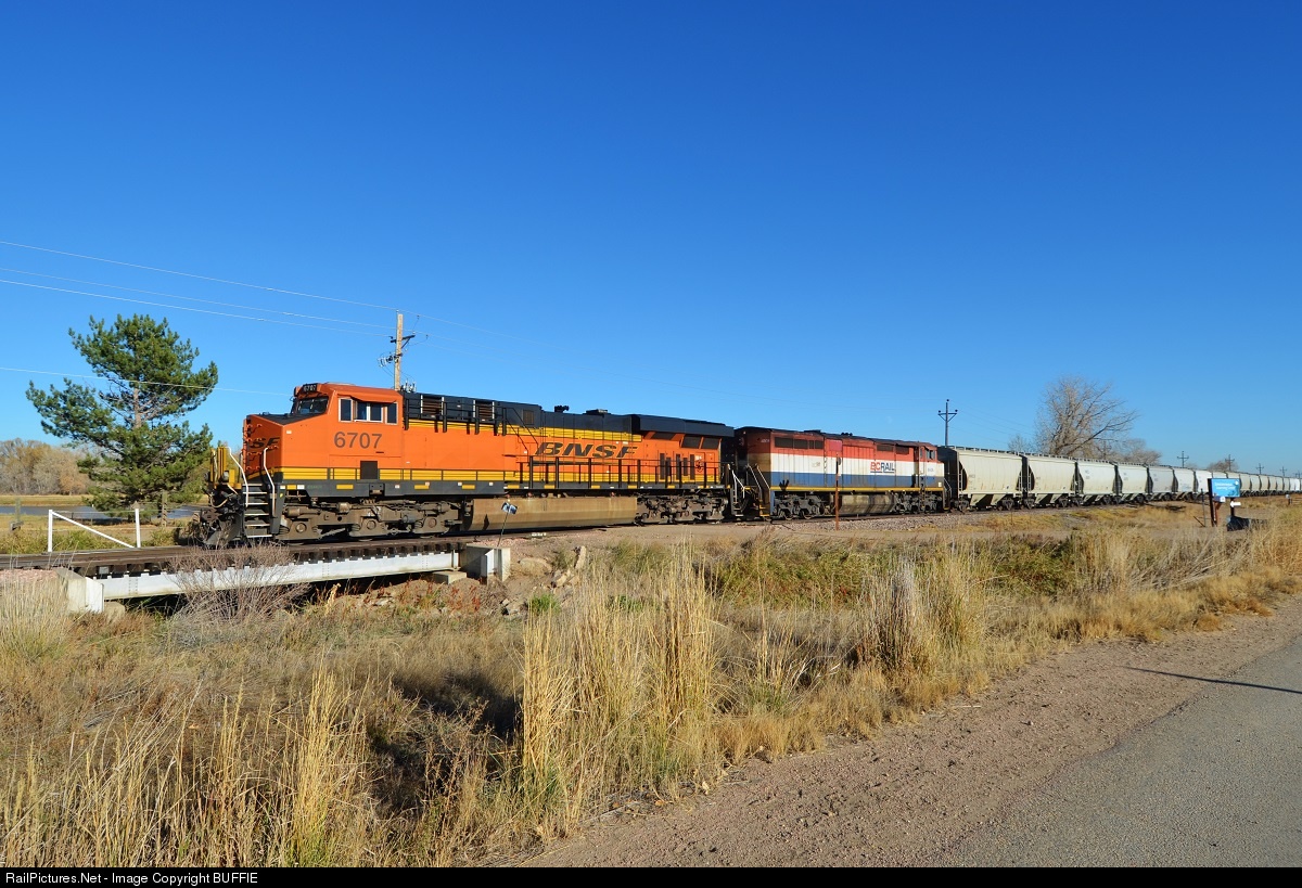 | BNSF 6706 (ES44C4) gets help from Canadian National / BC Rail 4608 (C40-8M) to move a sand train from Fort Collins to Windsor, Colorado . |