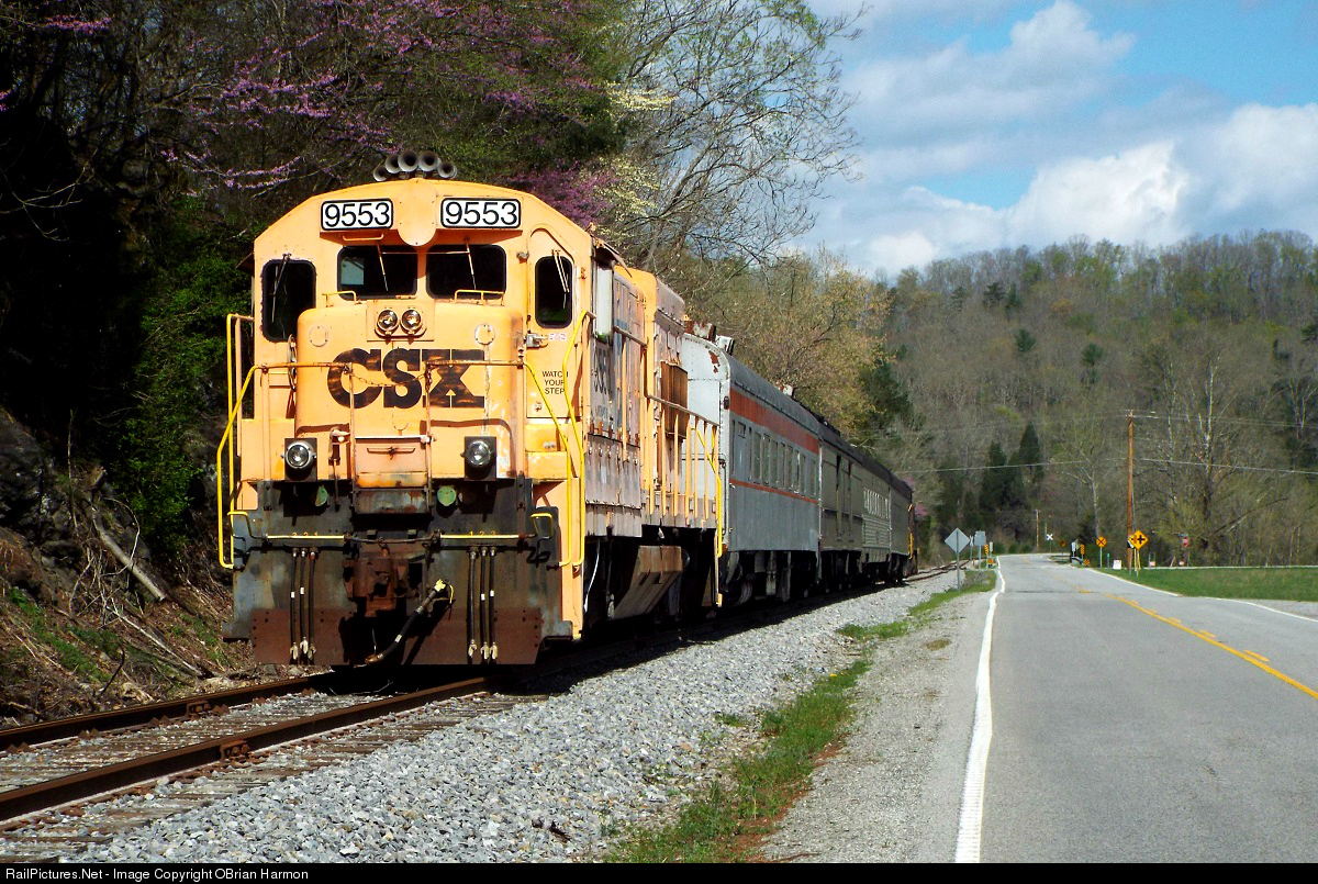 Passengers aboard the Heritage Railroad excursion get a great view of the Appalachian mountains and surrounding scenery as they are pushed by this former L&N GE U23B, originally numbered 2817. On the head end, a former Southern Railway U23B, (VLIX 3965), pulls the train out to the NS interchange at Blair, Tennessee.
