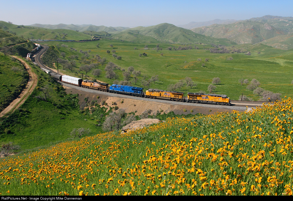 Tehachapi Pass is covered with springtime as a Union Pacific manifest climbs into Bealville, California, on February 25, 2016. The middle portion of the eastbound freight is stretched through the Allard horseshoe curve.
