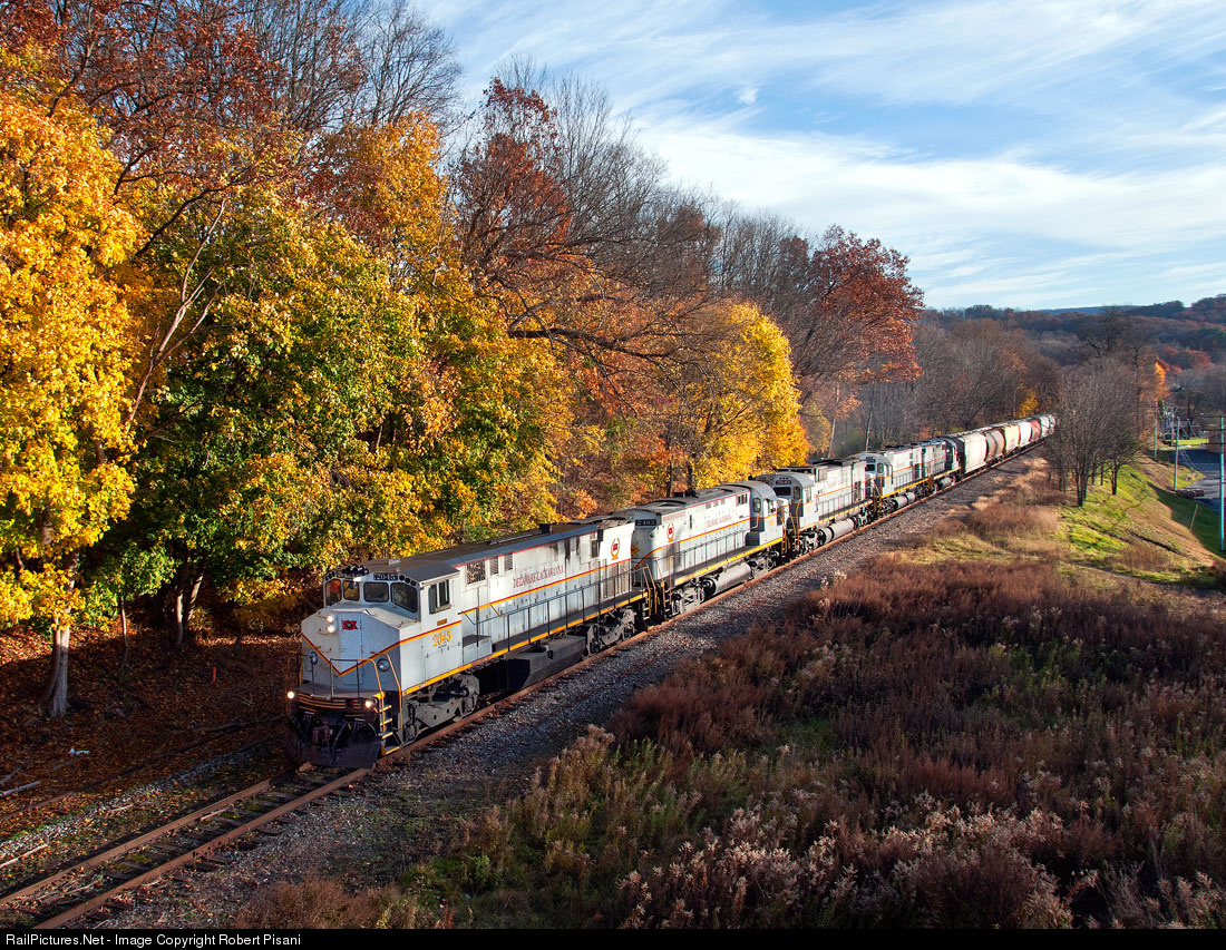 | On this day PT-97 is led by a matching consist of "corporate" painted units. The five units are bringing a unit train of grain loads west from the NS interchange at Portland. The last remnants of fall color cling to the trees at the lower elevations. Further up the line, trees in the Pocono Mountains are already bare. |