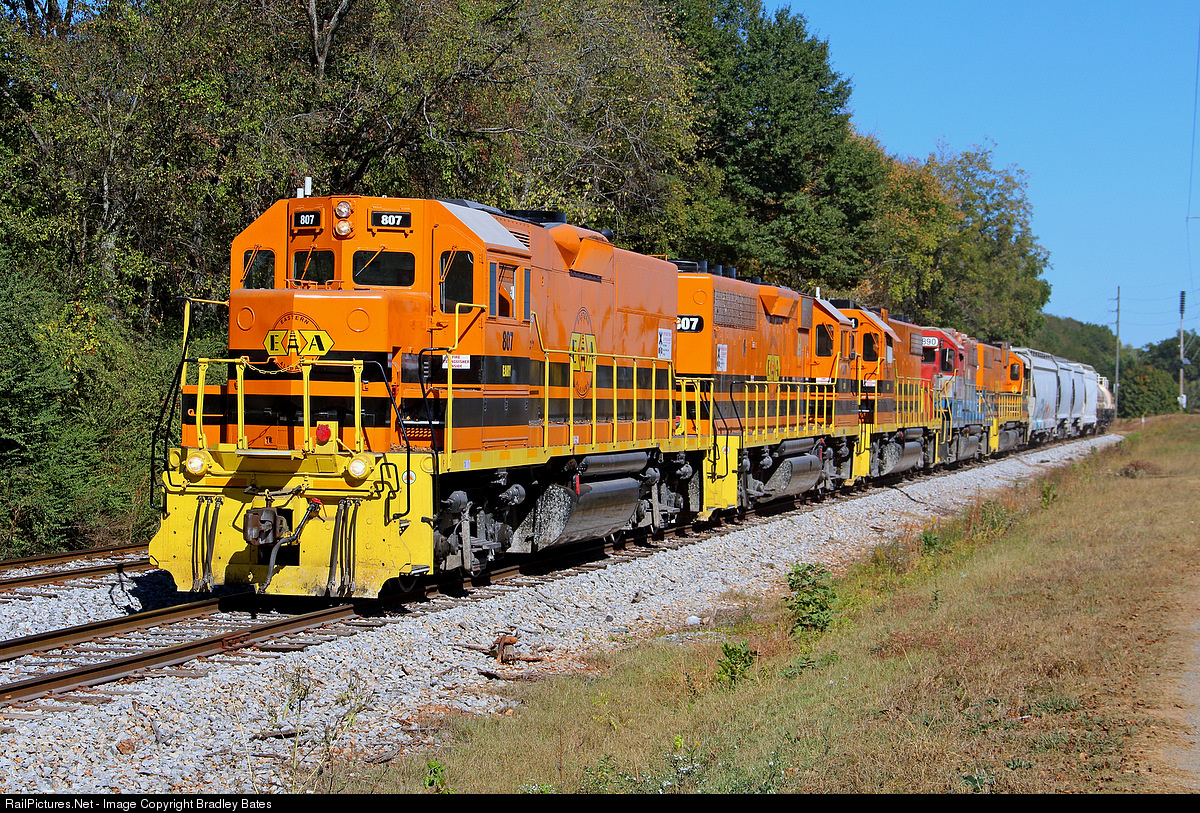 The EARY's Talladega turn heads back South to Sylacauga, AL. As they depart Bemiston, AL. With interchange from CSXT. The EARY used to only run to Talladega at night time, however starting around the first of 2016 they now can be seen running in daytime to Talladega on Monday, Wednesday & Friday's. The first 2 Locomotives have recently been repainted/renumbered. The EARY #807 used to be PRSX #6404 & was in primer paint which was pink. The 2nd locomotive in the consist used to be PRSX #6408 which was in Canadian National paint.