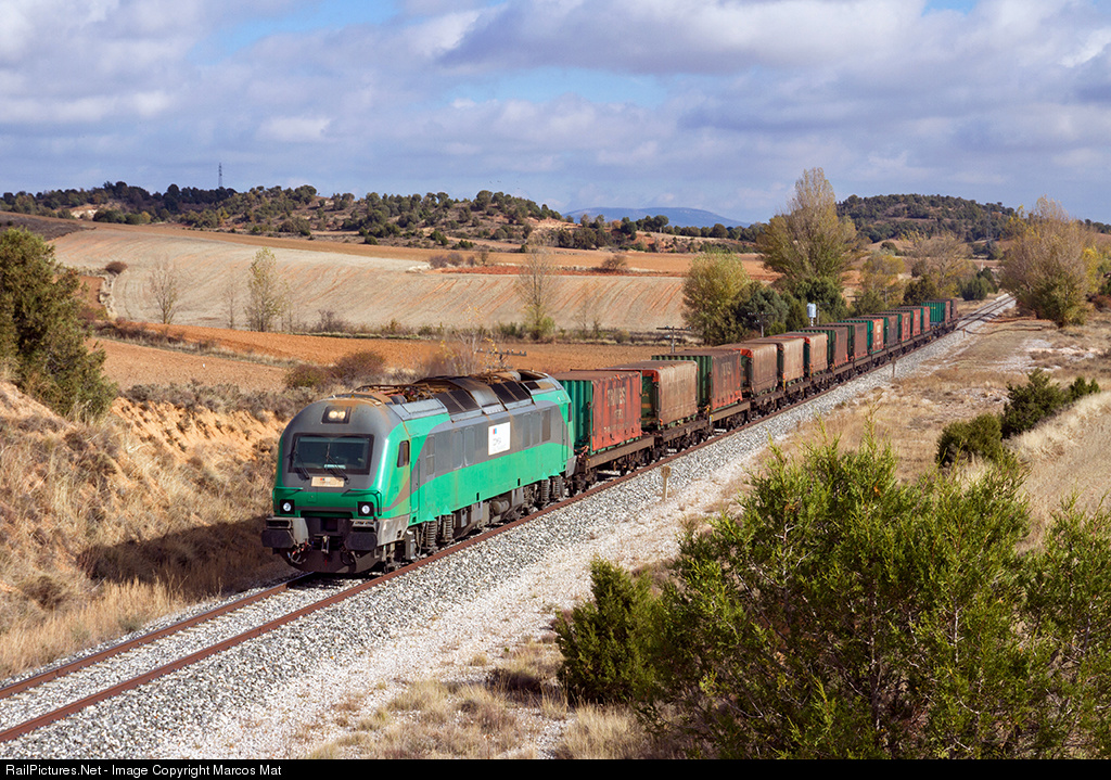 | First time I see a Bitrac running in diesel mode. And how the MTU engines sound !!! Making this photo was a crazy thing since three hours earlier we were 75 kilometers from here and we had the opportunity to photograph several freight trains in very good light conditions. Nothing to do with what we found in Bahabón with an evident dominion of the clouds on the clearings and with a single freight in perspective. To this must be added the fact that if the train arrived at its time, the front of the locomotive would remain in shadow. It was clear that the possibility of balancing our audacity with a failed failure was more than likely. But in our beloved "Directo" sometimes the unexpected becomes reality and the train departed from Aranda with a delay of 75 minutes and the sun made presence when we needed it most. The train was a steel freight Aranda de Duero-Santurce. |