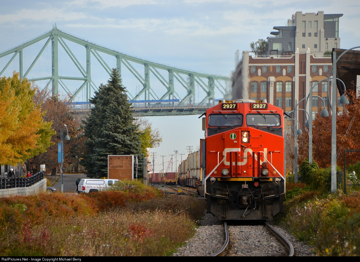 Delayed. CN 149 is having trouble releasing the brakes as it attempts to leave the Port of Montreal. Here it is stopped as the crew tries to get things going aain.