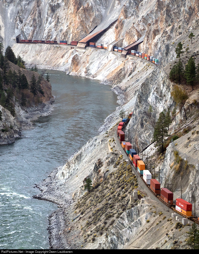 A Canadian Pacific stack train curls west through White Canyon on CN's treacherous Ashcroft Sub.