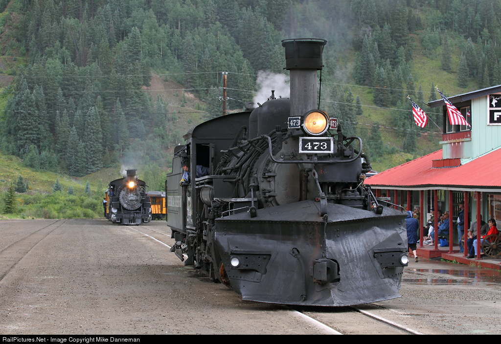 On August 13, 2015, Durango & Silverton Narrow Gauge Railroad ran a double header to Silverton, Colorado, pulled by road engine K-36 No. 486 and helper K-28 No. 473. After arriving at Silverton and unloading passengers, No. 473 has cut off and follows the train it helped, both backing down 12th Street heading for the wye.