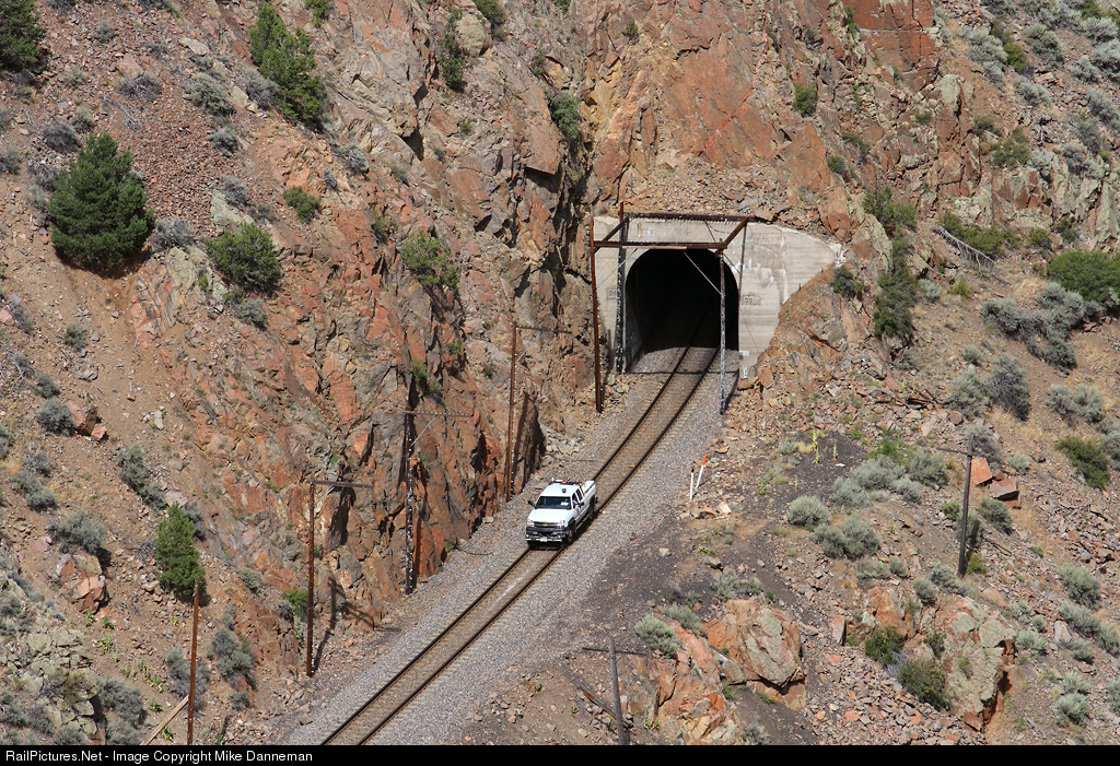 A Union Pacific hi-rail vehicle pops out of Tunnel 39 in Little Gore Canyon while inspecting the rugged Moffat Tunnel Subdivision main line between trains west of Azure, Colorado, on August 21, 2014.