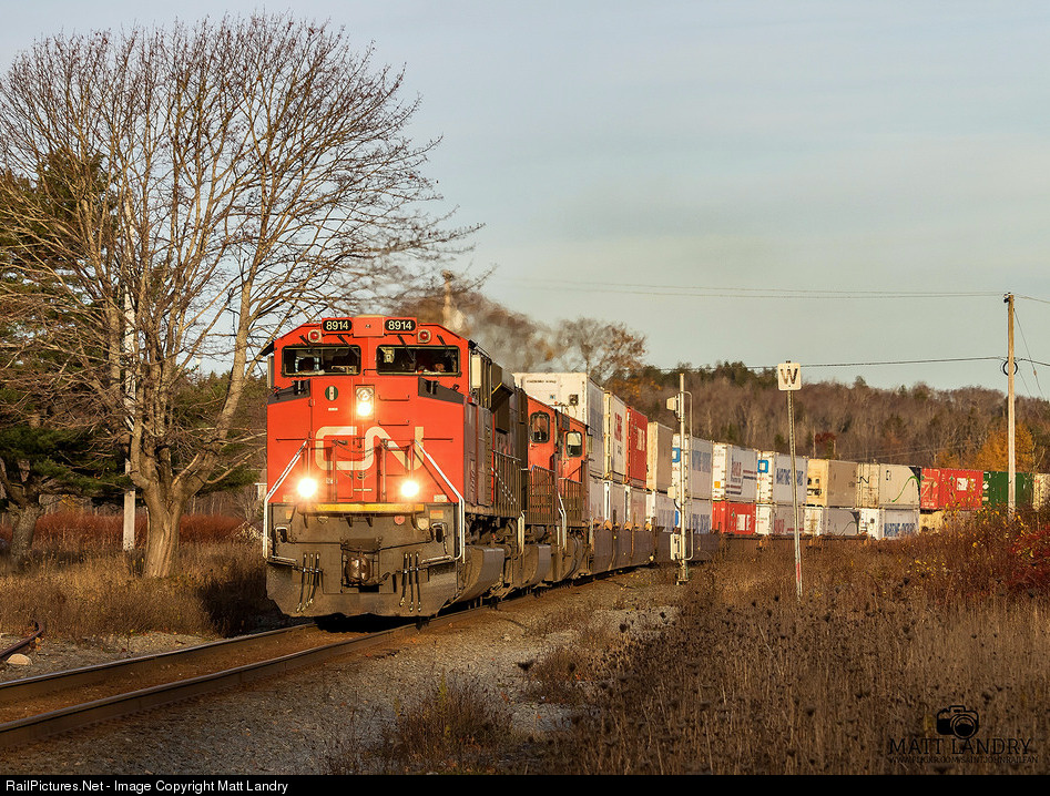 In some early morning light, CN 8914 leads stack train Q120, as they head into the sun at Windsor Junction, Nova Scotia. Visible somewhat on the left is the east leg of the old Windsor & Hantsport Railway wye track. The line hasn't been used in years, hence, the east switch to the CNR mainline has been removed.