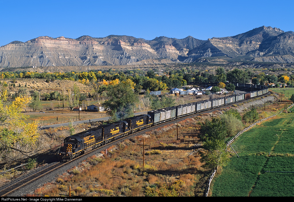 On the beautiful autumn morning of October 6, 2004, Union Pacific’s LJP45 “dirt train” local out of Helper cruises through Spring Glen, Utah. Hardly looks like the UP though, with three Rio Grande Tunnel Motors leading the way…