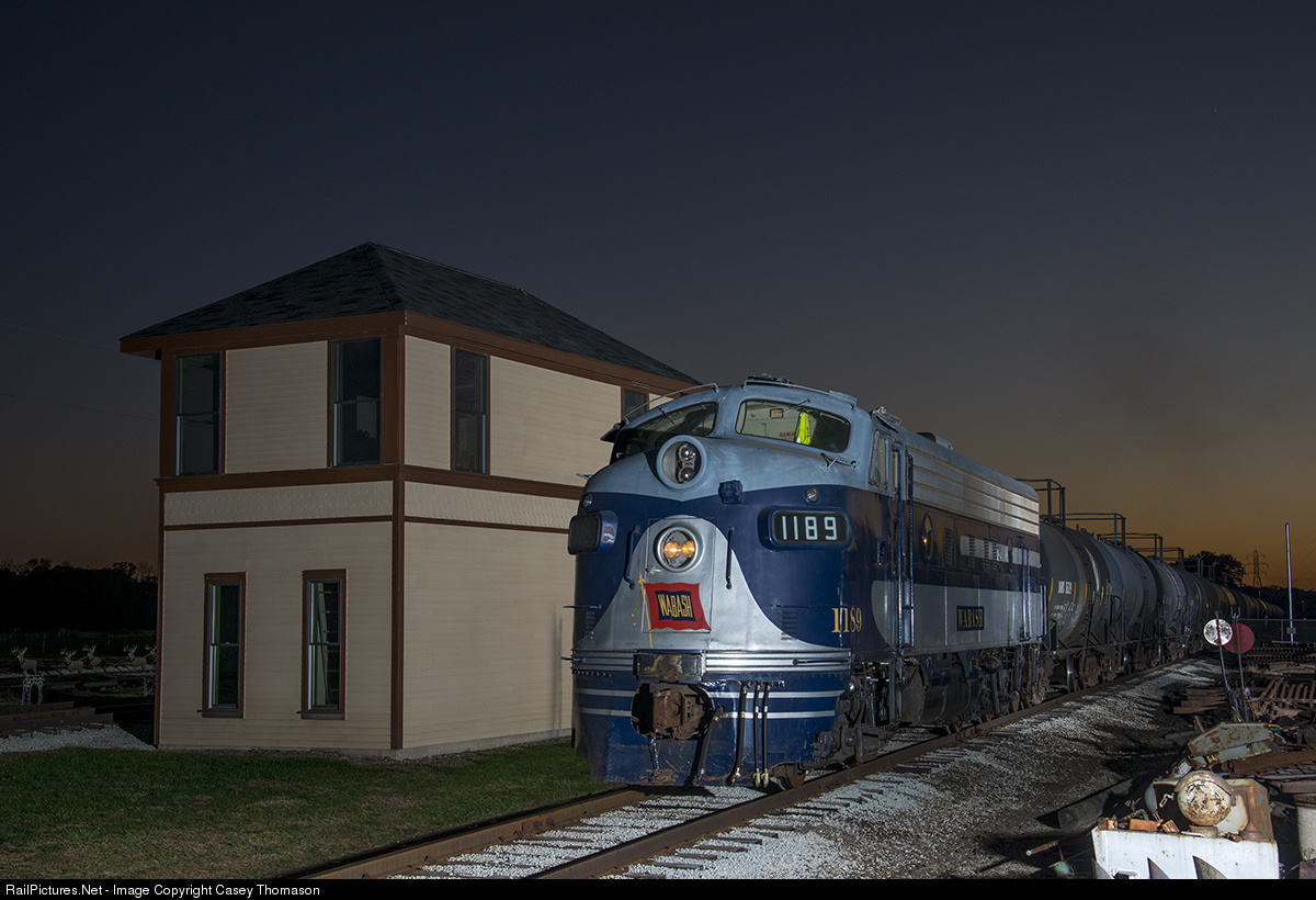 Making a rare "freight" move, Monticello Railway Museum's Wabash F7 #1189 lugs 53 tank cars bound for storage, passing Stair Tower on the Museum's grounds.
