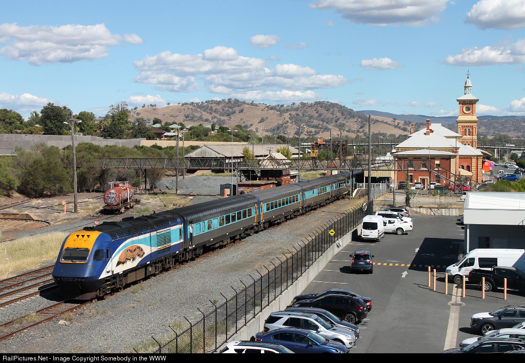 | The daylight XPT from Sydney to Melbourne slows for a station stop at the border town of Albury, once the break of gauge station between the New South Wales and Victorian networks. |