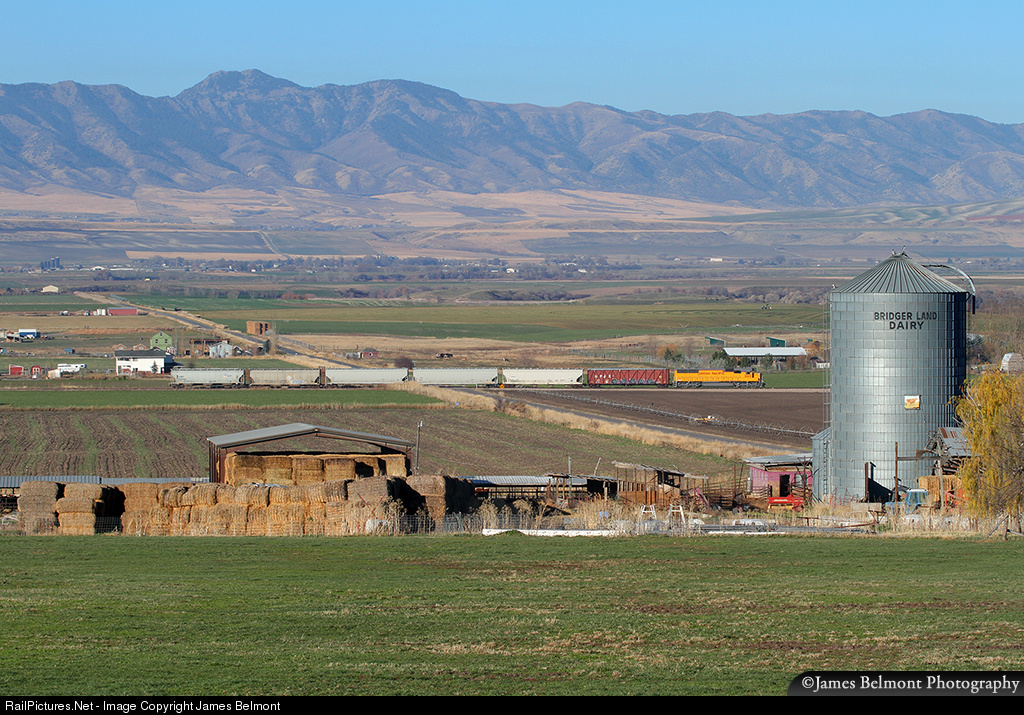 | Union Pacific's Cache Valley Local rolls northbound past the Bridger Land Dairy in the town Richmond, Utah on Nov. 9, 2016. On the opposite side of the valley below Gunsight Peak are the small towns of Clarkston and also Trenton which hosts the Ogden Subdivision main. The Idaho state line is just over five miles further up the line. |